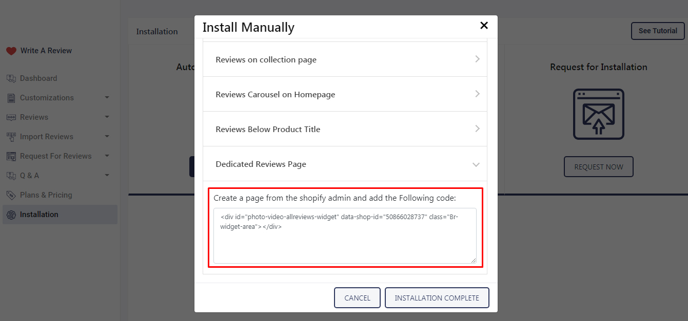 3. It will open a pop-up. Click on 'Dedicated Reviews Page' & copy the code in the box.