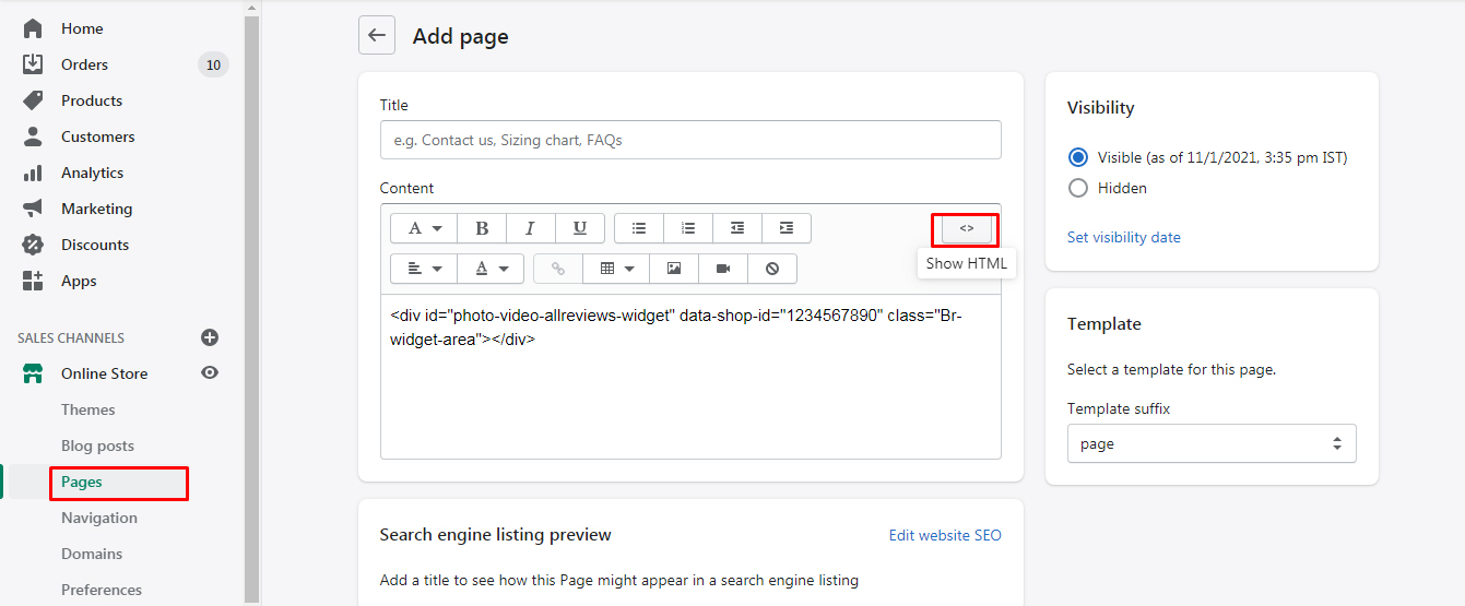 4. Create a page in your Shopify store & paste the code in the HTML section of the content.