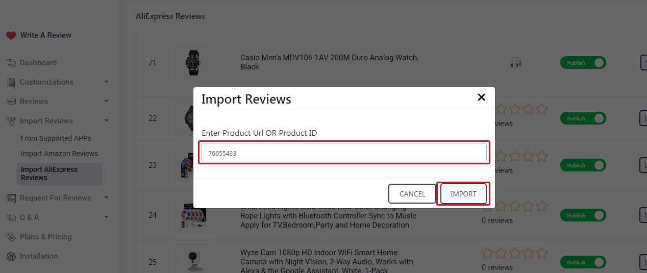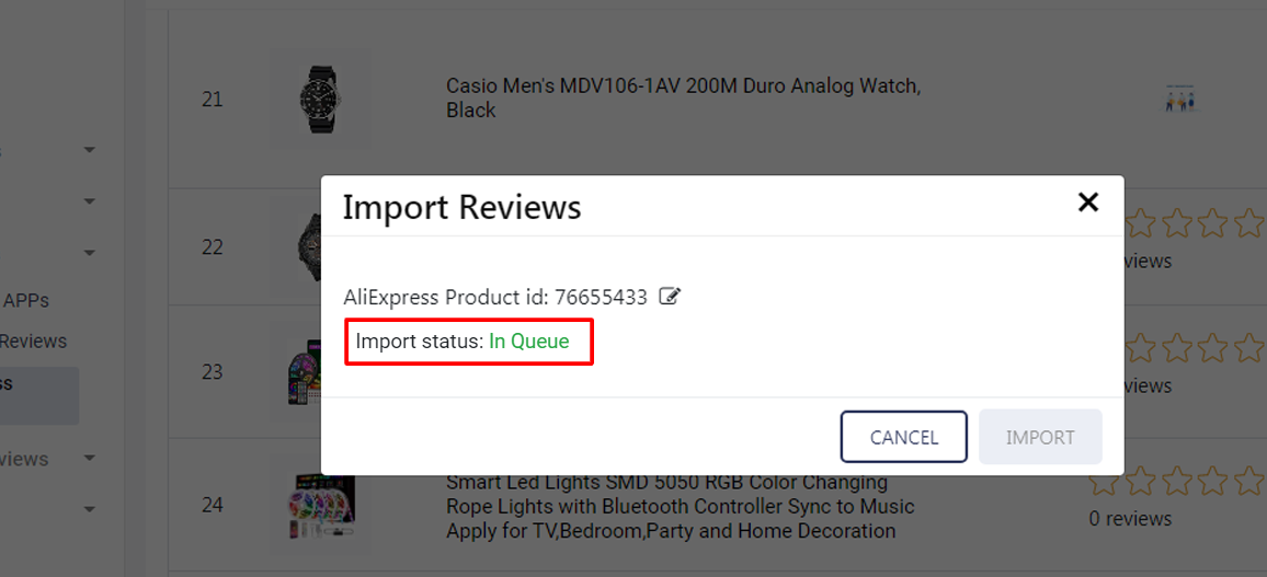 3. Go to Reviews => Import AliExpress Reviews & click on the import button next to products.