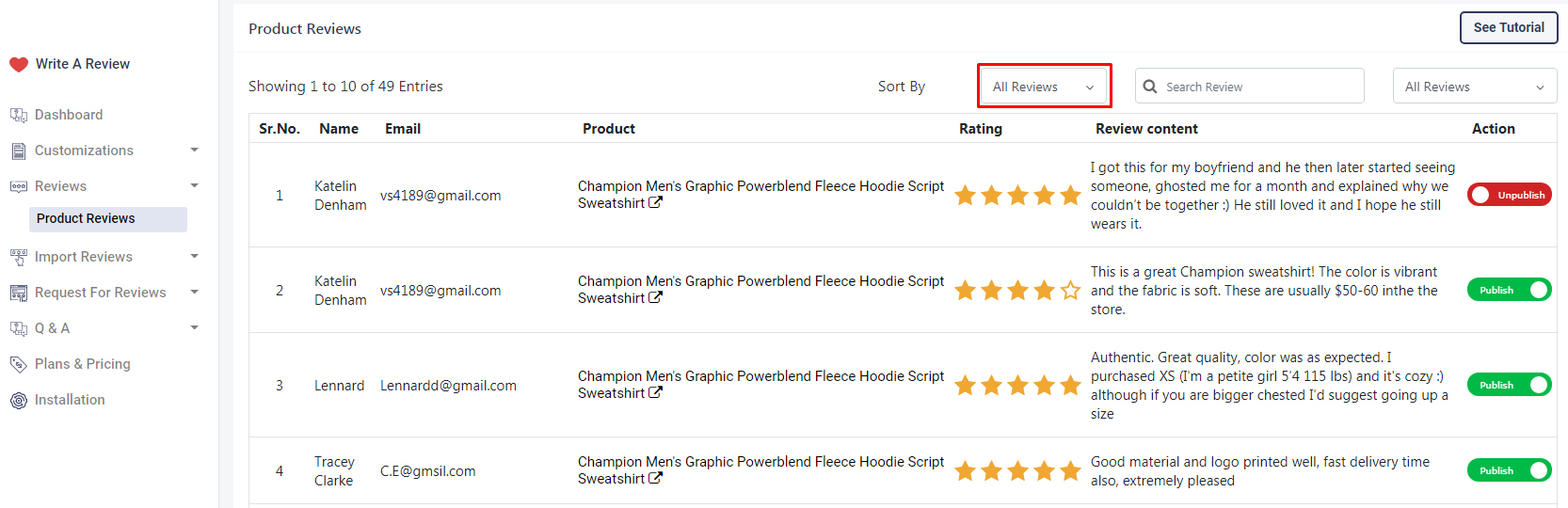 - Display All Reviews, Published Reviews, or Unpublished Reviews.