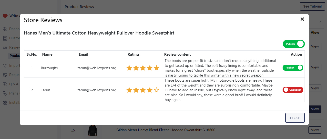 - Publish/Unpublish button. It will Publish/Unpublish all the reviews on that page.