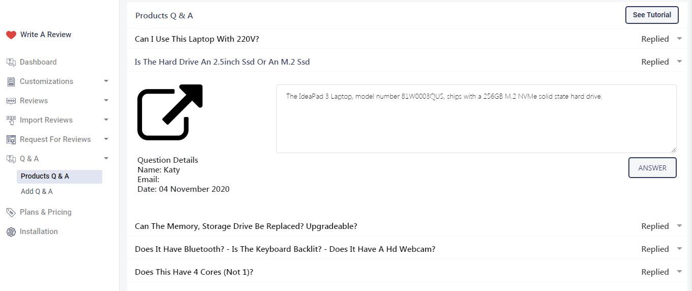Bright Product Reviews provides a Questions & Answers widget for your customers to ask questions regarding products.