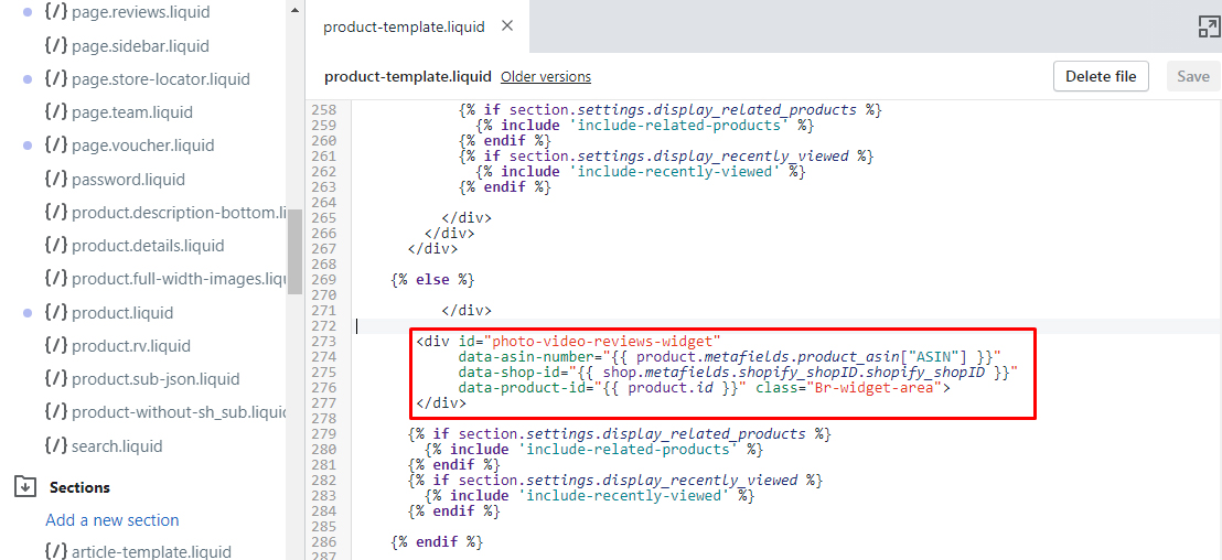 <div id="photo-video-reviews-widget" data-asin-number="{{ product.metafields.product_asin["ASIN"] }}" data-shop-id="{{ shop.metafields.shopify_shopID.shopify_shopID }}" data-product-id="{{ product.id }}" class="Br-widget-area"></div>