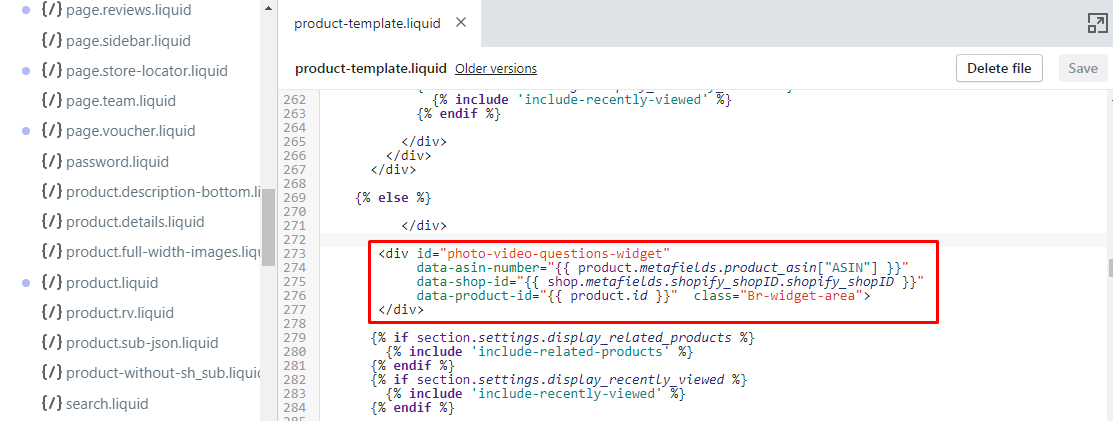 <div id="photo-video-questions-widget" data-asin-number="{{ product.metafields.product_asin["ASIN"] }}" data-shop-id="{{ shop.metafields.shopify_shopID.shopify_shopID }}" data-product-id="{{ product.id }}" class="Br-widget-area"></div>