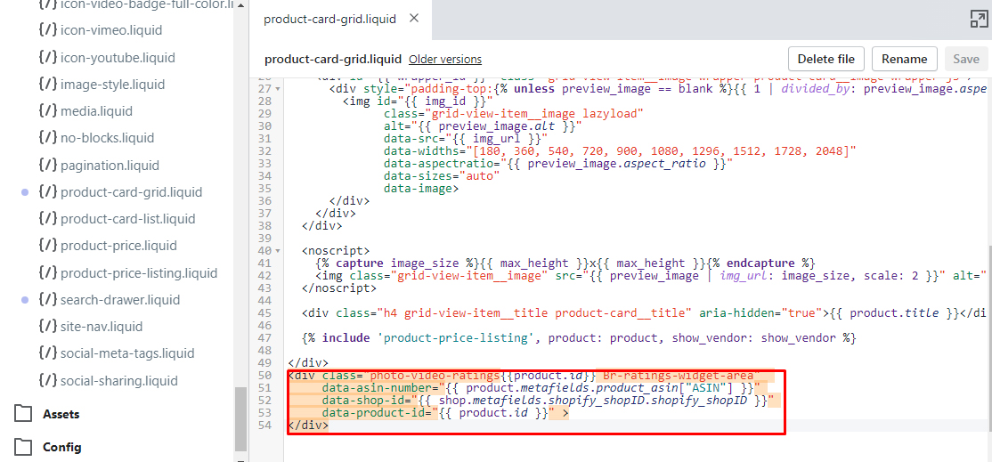 <div class="photo-video-ratings{{product.id}} Br-ratings-widget-area" data-asin-number="{{ product.metafields.product_asin["ASIN"] }}" data-shop-id="{{ shop.metafields.shopify_shopID.shopify_shopID }}" data-product-id="{{ product.id }}"></div>
