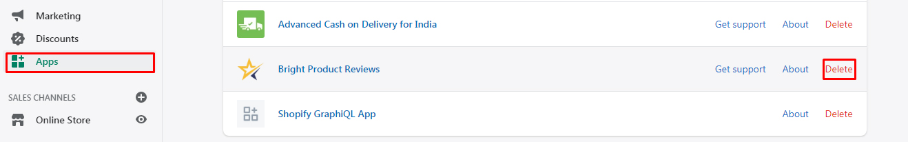 To uninstall the Bright Product Reviews APP go to "Apps" from the Shopify admin.